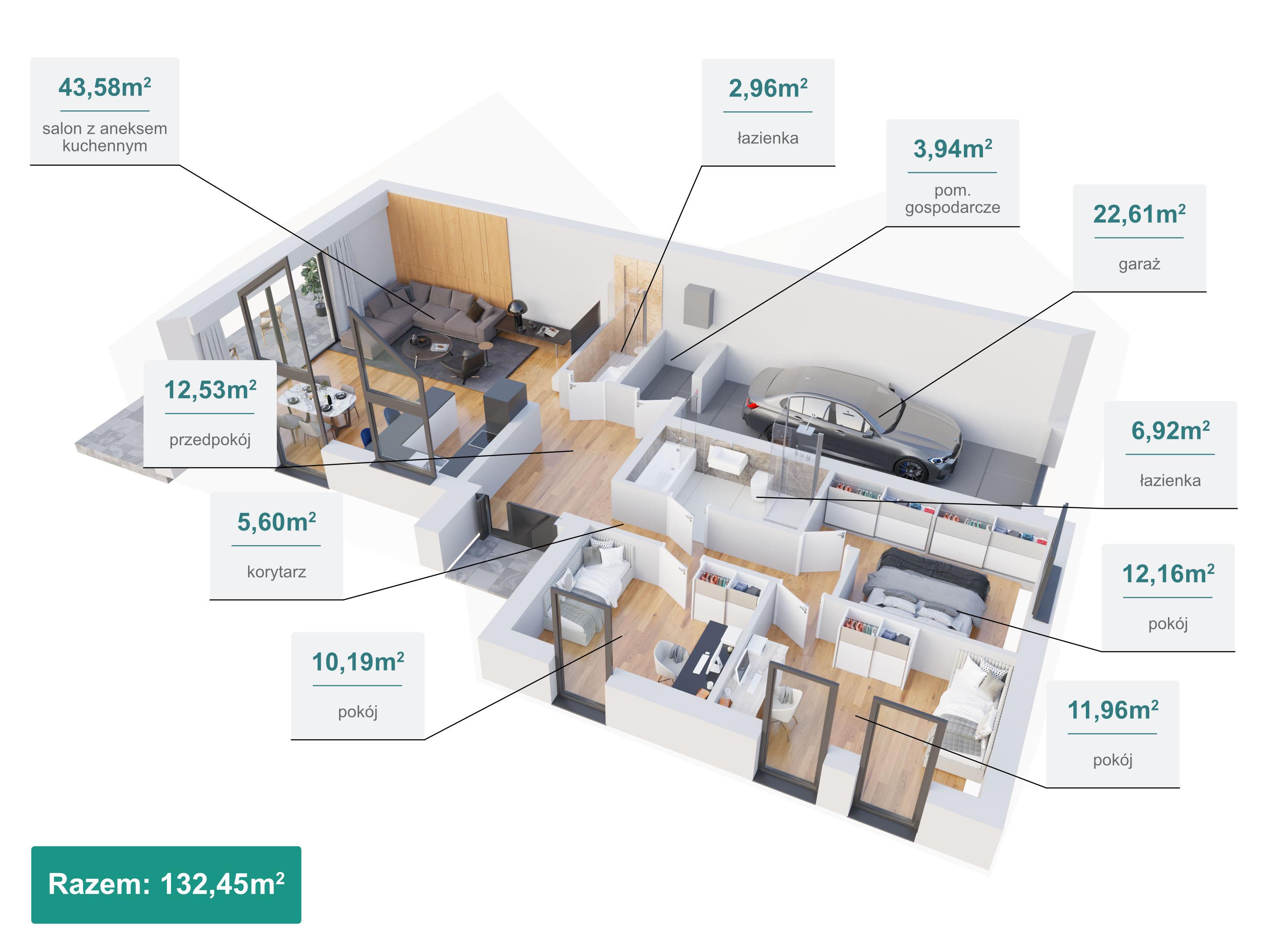 Na powierzchnię użytkową 127,91 m² lub 132,45 m² składają się: 4 pokoje, aneks kuchenny z jadalnią, 2 łazienki, pomieszczenie gospodarcze oraz wysoki na 6 metrów, dobrze doświetlony salon z kuchnią.
