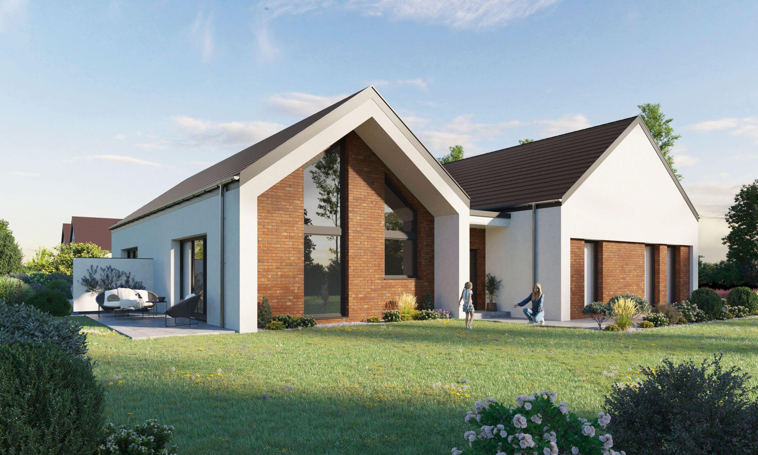 Harmonia przestrzeniDom jednorodzinny dwulokalowy, parterowy posadowiony na dużej działce. Ciekawa architektura, funkcjonalny podział na strefę dzienną i nocną. Świetne rozwiązanie dla mniejszych rodzin, par oraz singli, którzy chcą gościć przyjaciół i bliskich w przestronnym i wygodnym domu.